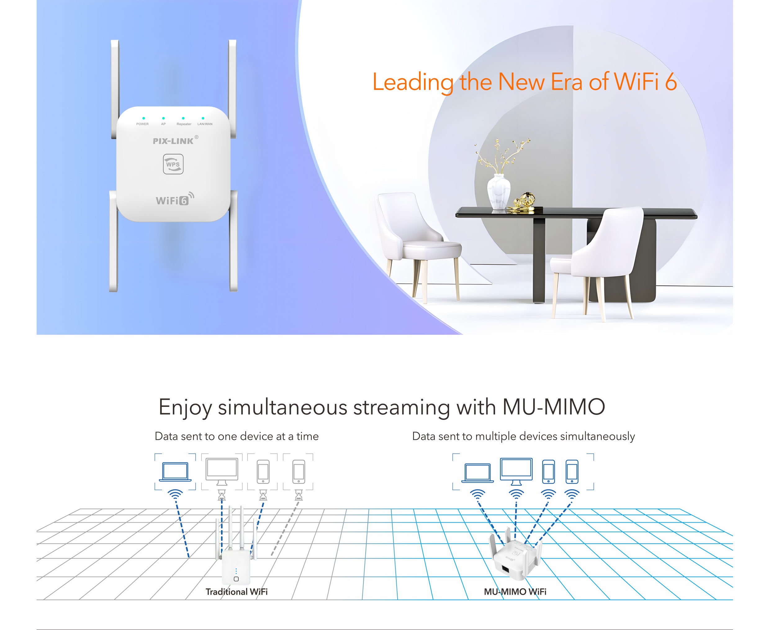 PIX-LINK 2025 New WiFi 6 Repeater Extender 1800Mbps Dual Band – 4 Antennas with APP Control