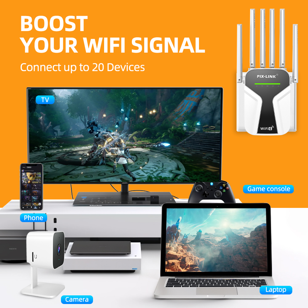Upgrade your home network to the next generation with the PIXLINK AX28 WiFi 6 Repeater! This powerful device is designed to eliminate WiFi dead zones and bring blazing-fast, stable internet to every corner of your home or office. Featuring 6 high-gain antennas, advanced WiFi 6 technology, and a dual-band speed of up to 1800Mbps, it’s the ultimate solution for seamless 4K streaming, online gaming, and video conferencing. With multiple operation modes and an easy setup, it’s the perfect extension for any existing router.